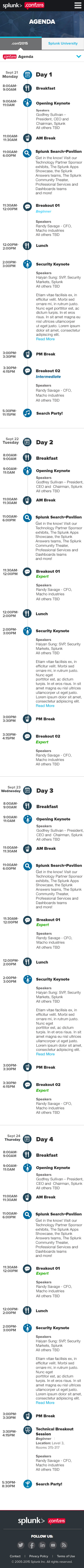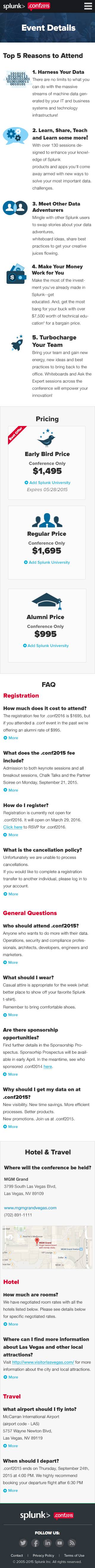 .Conf is Splunk's annual users conference showcasing and connecting all things Splunk. The .conf microsite serves as an informative base for those interested and potential attendees of .conf events. The .conf2015 microsite was an entire redesign of the original .conf microsite using a visual style and language based off of the new splunk.com website, using responsive design elements, implemented on a new (AEM) CMS, and would be reuseable for future .conf events beyond .conf2015 For this project I worked closely with Splunk's event marketing, creative services, and development teams- and created the responsive layouts and UI design, created image selections and unique iconography where required.